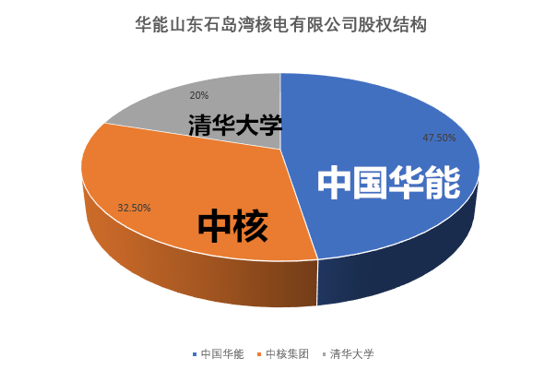 华能山东石岛湾核电有限公司由中国华能集团、中核集团公司、清华大学各出资47.5%、32.5%和20%于2007年1月共同组建,位于山东省荣成市,负责我国具有自主知识产权的高温气冷堆核电站示范工程的建设与运营管理。