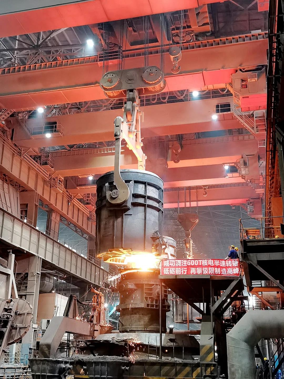 此次冶炼浇注的 600吨核电半速转子是核电站发电机组中的核心部件,属超大型产品,采用两台电炉分别连续生产8炉钢水,3台320t行车连续运转,四个150t钢包连续浇注的方式完成。