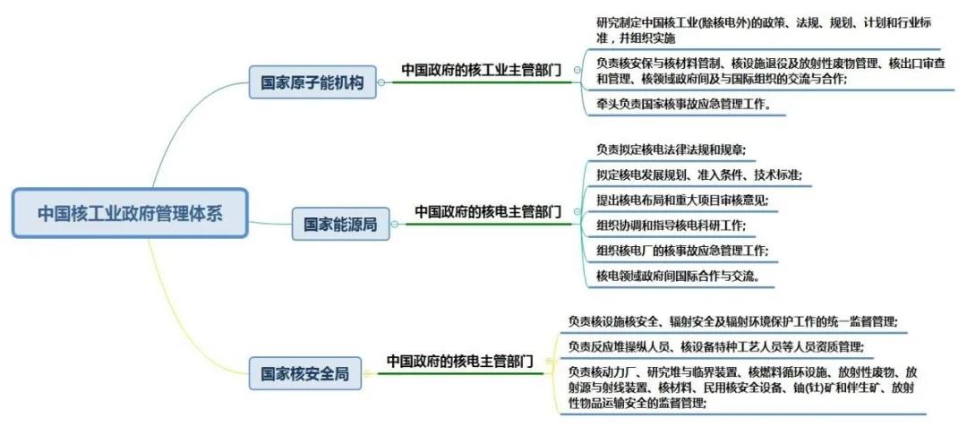 国家能源局是中国政府的核电主管部门,负责拟定核电法律法规和规章;拟定核电发展规划、准入条件、技术标准;提出核电布局和重大项目审核意见;组织协调和指导核电科研工作;组织核电厂的核事故应急管理工作;核电领域政府间国际合作与交流。