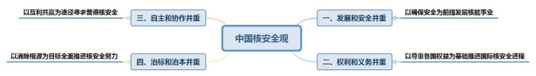 2014年3月24日,在荷兰海牙举行的第三届核安全峰会上,习近平发表讲话,首次全面阐述了理性、协调、并进的核安全观。其核心内涵是“四个并重”:一是发展和安全并重,以确保安全为前提发展核能事业;二是权利和义务并重,以尊重各国权益为基础推进国际核安全进程;三是自主和协作并重,以互利共赢为途径寻求普遍核安全;四是治标和治本并重,以消除根源为目标全面推进核安全努力。《中国的核安全》白皮书指出,中国核安全观是习近平新时代中国特色社会主义思想在核安全领域的集中体现,是中国总体国家安全观的重要组成部分。