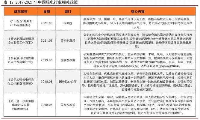 2018-2021 年,中国陆续出台了多个核电行业政策,保障核电运营的规范性和安全性。核电行业政策和国家对于低碳排放及推广清洁能源的要求成为了核电行业持续发展的 重要推力。