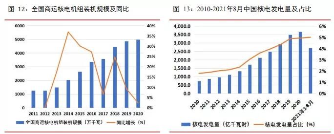 根据国家能源局,截至 2021 年 6 月 30 日,全国发电装机容量 22.6 亿千瓦,比上年末增 长 9.5%。据中国核能行业协会统计,截至 2021 年 6 月 30 日,大陆运行核电机组共 51 台,装机容量为 5,327.495 万千瓦(额定装机容量),占全国发电装机容量的 2.36%。2021 年 1-6 月,全国累计发电量为 38717.0 亿千瓦时,运行核电机组累计发电量为 1950.91 亿千瓦时,占全国累计发电量的 5.04%,比 2020 年同期上升了 13.76%;累计上网电量 为 1830.51 亿千瓦时,比 2020 年同期上升了 14.12%。