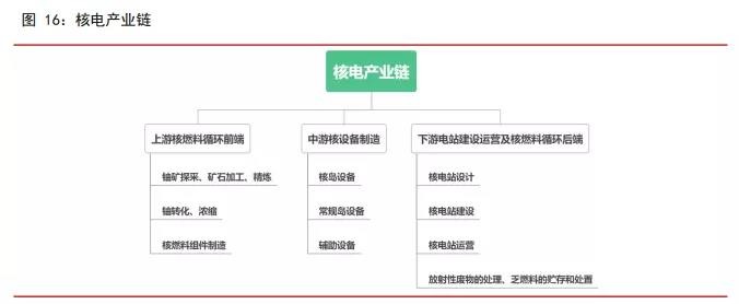 核电产业链的上游为铀矿开采加工精炼、铀转化浓缩和核燃料组件制造;中游为核电设 备制造环节,主要包括核岛设备、常规岛设备和辅助设备;下游是核电站建设运营及乏 燃料处理等。