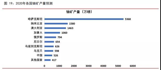随着 2020 年初全球新冠病毒疫情的爆发,全球多个铀矿暂停运行。加拿大在 2020 年 3 月宣布,暂停雪茄湖矿和麦卡琳湖水冶厂的生产,哈萨克斯坦在同年 4 月初也宣布将减 少所有铀矿的运营活动。疫情还对澳大利亚、纳米比亚或南非等国家的采矿作业造成限 制,2020 年全球铀生产量受到一定影响。根据标普全球市场财智,2018 和 2019 年全球 铀矿产量分别为 13710 万磅和 13500 万磅,预计 2020 年铀矿产量为 13030 万磅(约 59103 吨),较 2019 年有所减少。2020 年,哈萨克斯坦、纳米比亚、澳大利亚、加拿大、俄 罗斯和尼日尔是全球铀矿生产的六大国,合计产量约占全球产量的 84%,全球超过 40% 的铀矿产量来自哈萨克斯坦。