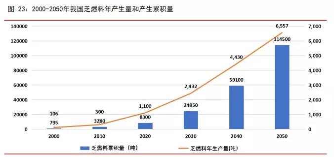 我国核电站乏燃料后处理市场需求紧迫,产业前景广阔。根据国家能源局估算,一台百万千瓦级压水堆核电站,每年产生的乏燃料约 20-25 吨。中国核能行业协会发布的数据 显示,截至 2020 年 12 月底,中国大陆地区已运行核电机组共 49 台,合计装机 5103 万 千瓦,对应乏燃料年产量将达到 1,000 吨以上。中国目前已积累较大规模的乏燃料,且 未来的年产出规模还将随着核电站数量增加进一步扩大。随着我国核电建设步入快车 道,核电站卸出的乏燃料规模正在不断增长。