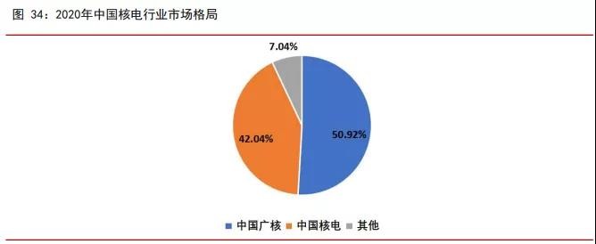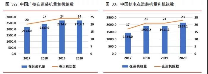 中国广核是中国在运装机规模最大的核电开发商与运营商。截止 2020 年底,中国广核 和中国核电在运核电机组分别为 24 台和 23 台,在建机组分别为 7 台和 4 台,在建总装 机容量为别为 821 亿千瓦时和 470.3 亿千瓦时。中国核电装机容量低于中广核是因为中 国核电的核电单机组容量小于中国广核,2017 年后中国广核投产的核电机组单机容量均 超过 110 万千瓦,而中国核电部分单机容量低于 100 万千瓦。按发电量计算,2020 年中 国广核和中国核电的国内市占率分别为 50.92%和 42.04%。