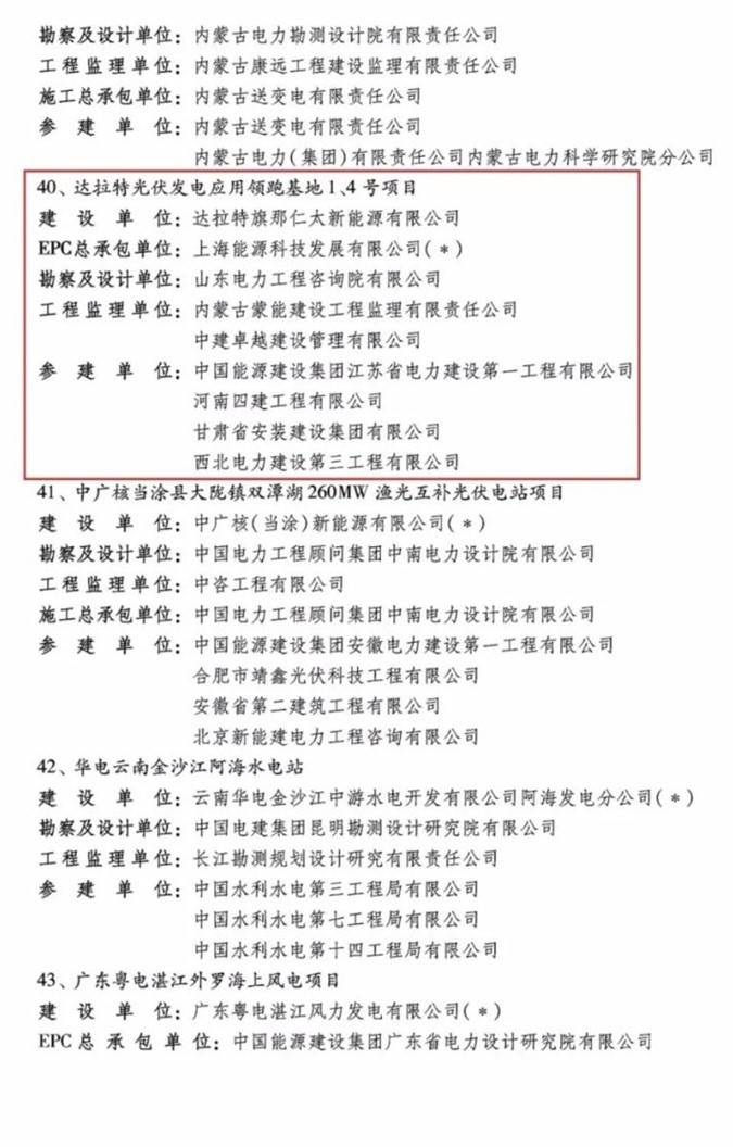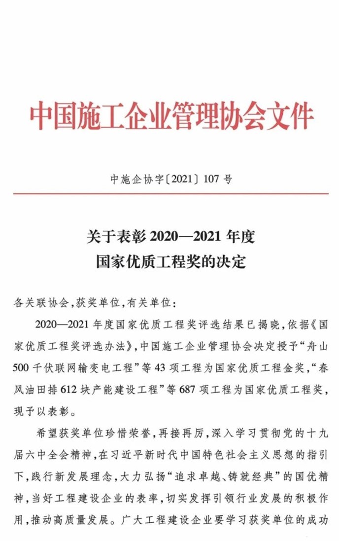 12月6日,中国施工企业管理协会公布了《关于表彰2020—2021年度国家优质工程奖的决定》(中施企协字〔2021〕107号),由甘肃建投安装公司参建的达拉特光伏发电应用领跑基地1、4号项目荣获“2020—2021年度国家优质工程奖”。