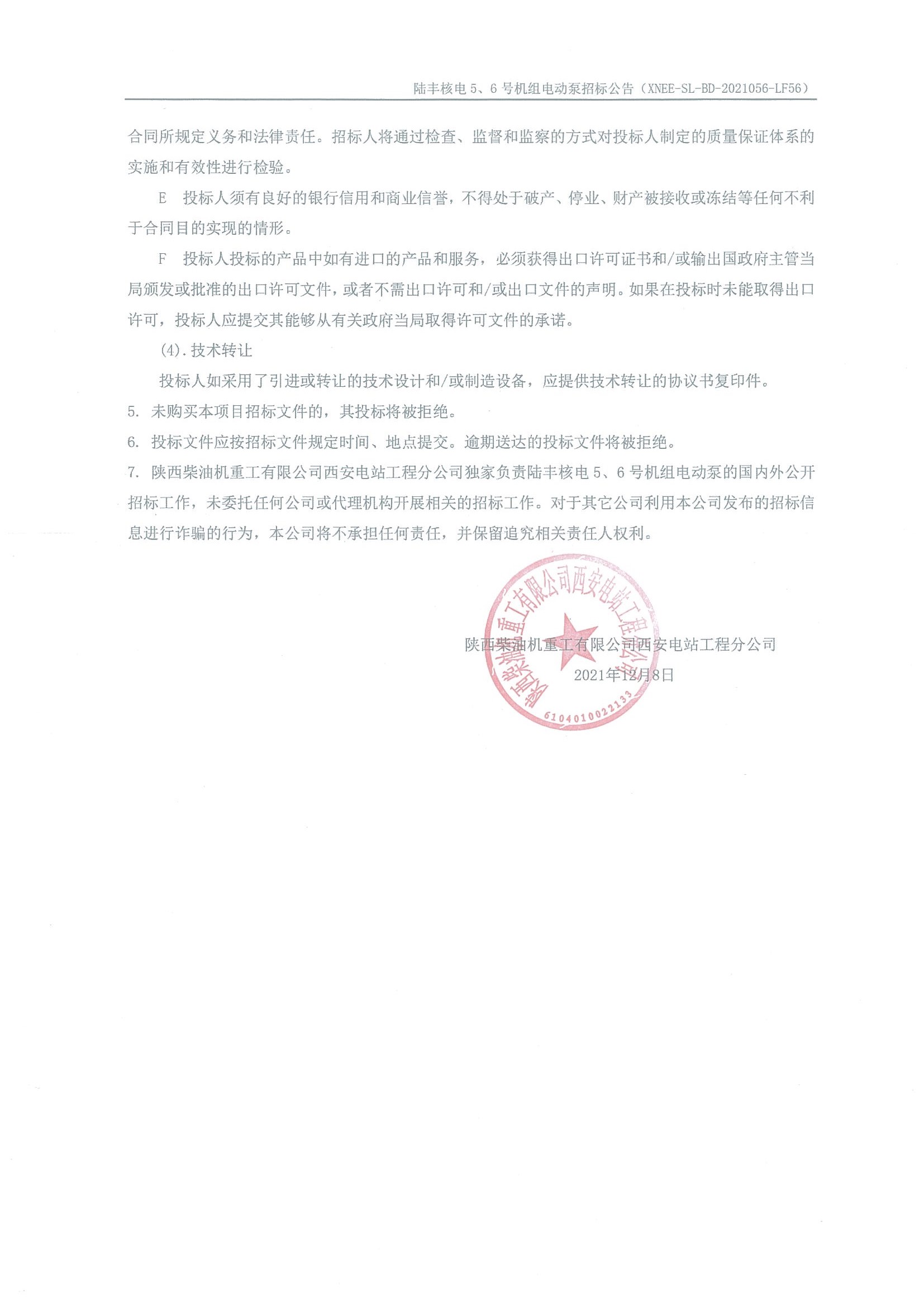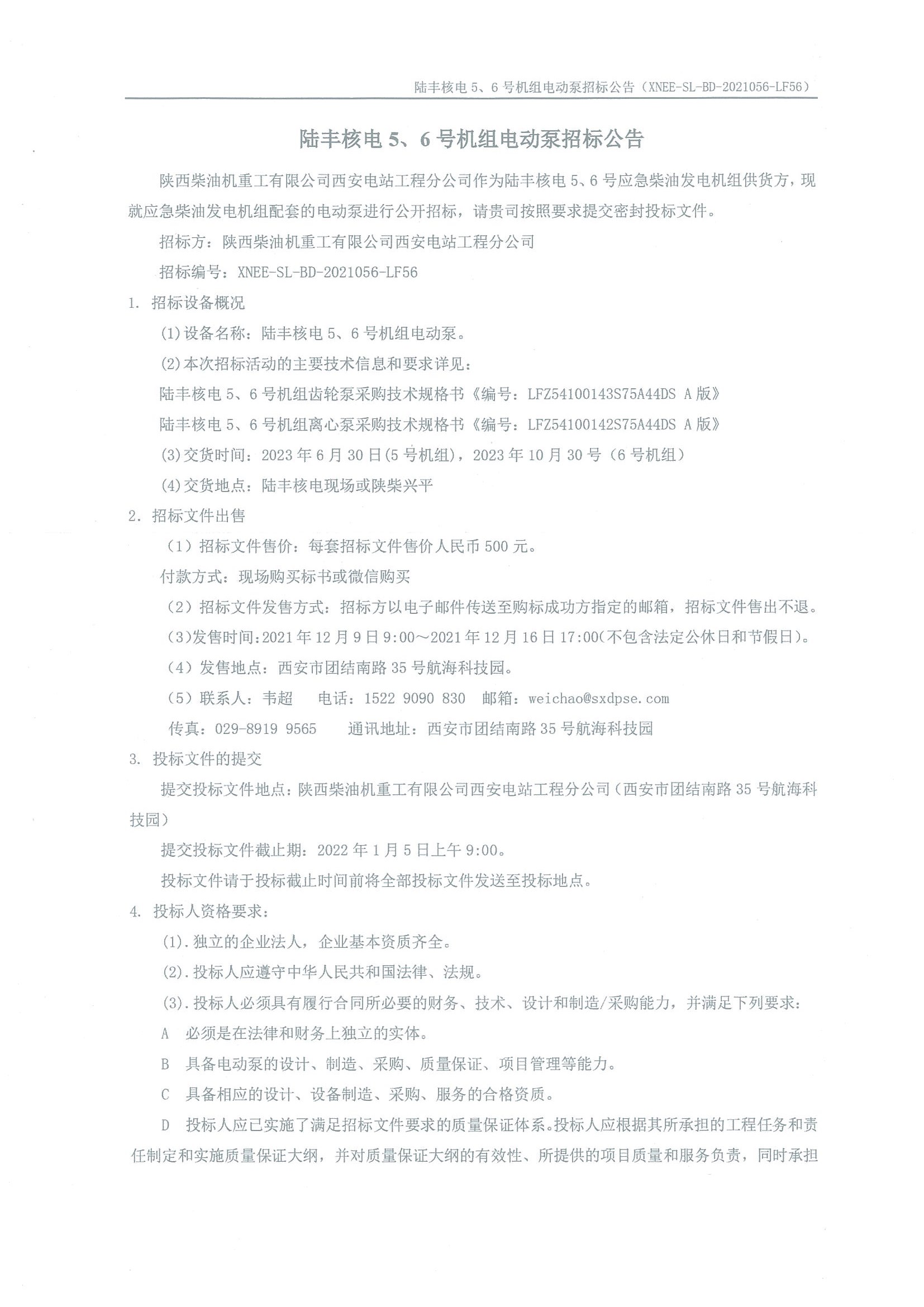 陆丰核电5、6号机组电动泵招标公告21-12-09