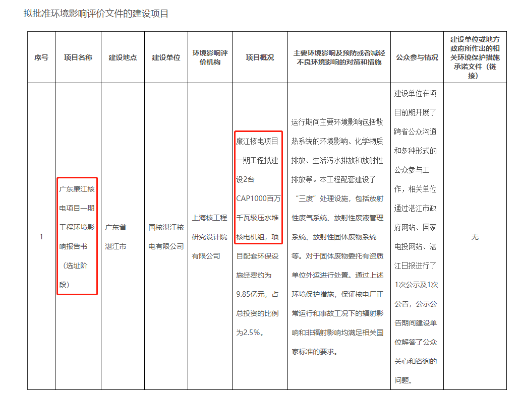 生态环境部发布关于2021年12月13日拟作出的建设项目环境影响评价文件审批意见的公示(核与辐射),其中廉江核电项目一期工程拟建设2台CAP1000百万千瓦级压水堆核电机组。