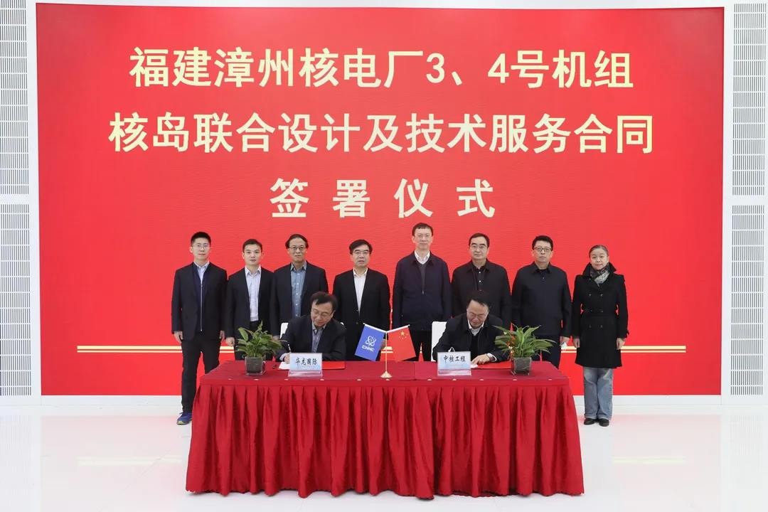 12月15日,在华龙国际核电技术有限公司党委书记、总经理高立本,中核国电漳州能源有限公司总经理宋丰伟,中国核电工程有限公司总经理、党委副书记荆春宁等领导的见证下,华龙国际副总经理信天民、漳州能源副总经理蒋祖跃、中核工程副总经理陈学营、中国核动力研究设计院副院长唐传宝共同签署了《福建漳州核电厂3、4号机组核岛联合设计及技术服务合同》。
