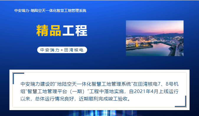 中安瑞力建设的“地陆空天一体化智慧工地管理系统”在田湾核电7、8号机组“智慧工地管理平台(一期)”工程中落地实施,自2021年4月上线运行以来,总体运行情况良好,近期顺利完成竣工验收。