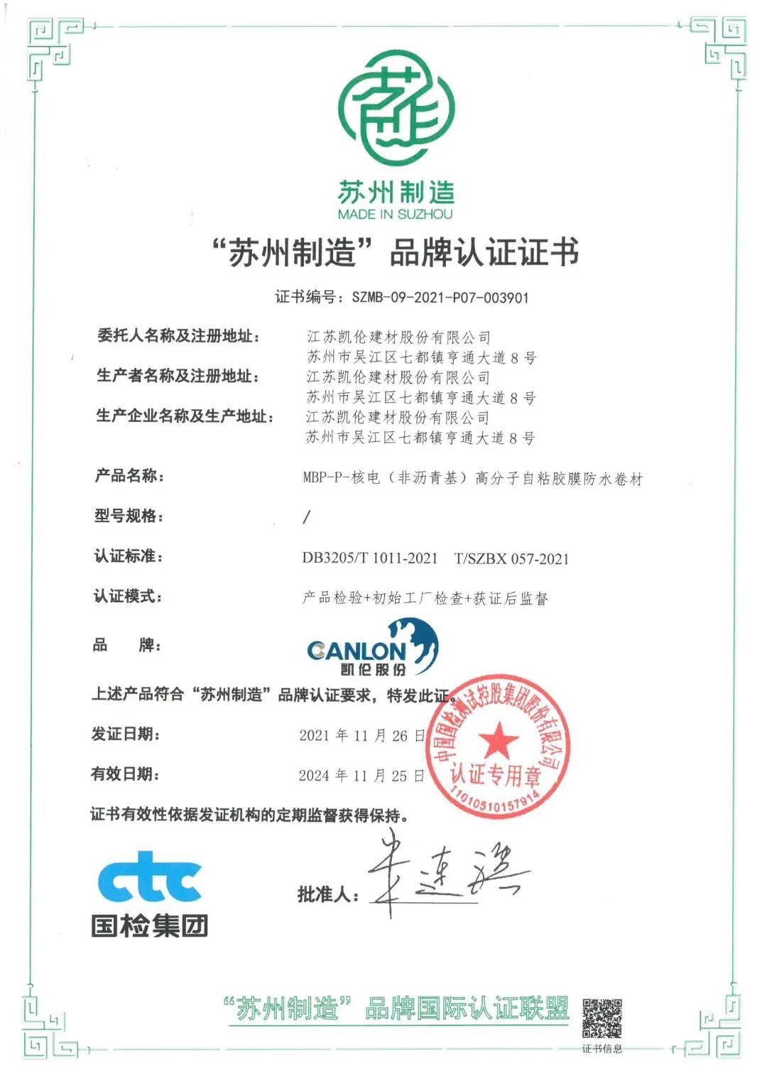 2021年12月27日,苏州市市场监督管理局发布了《2021年度“苏州制造”品牌认证获证企业产品名单》,凯伦股份“MBP-P-核电(非沥青基)高分子自粘胶膜防水卷材”顺利入选。