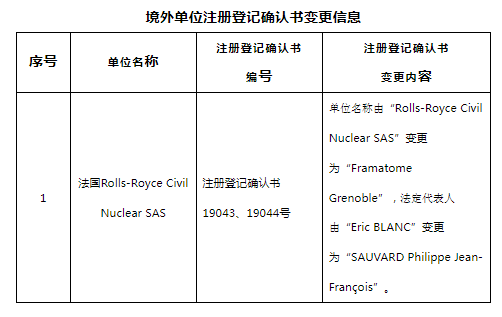 近日,国家核安全局发布关于同意东方电气股份有限公司等6家单位民用核安全设备许可证和法国Framatome Grenoble境外单位注册登记确认书信息变更的通知,同意东方电气股份有限公司、中国能源建设集团浙江火电建设有限公司、中广核检测技术有限公司等6家单位民用核安全设备许可证信息变更。