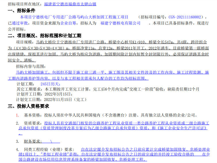[福建省] 福建省宁德核电厂专用进厂公路马屿山大桥加固工程施工项目招标公告