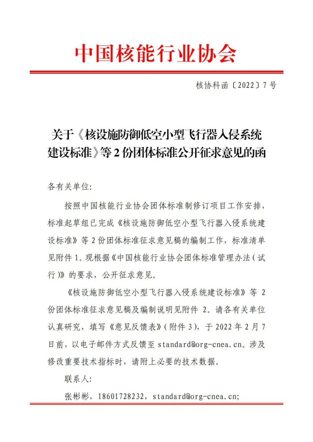 关于《核设施防御低空小型飞行器入侵系统建设标准》等2份团体标准公开征求意见的函