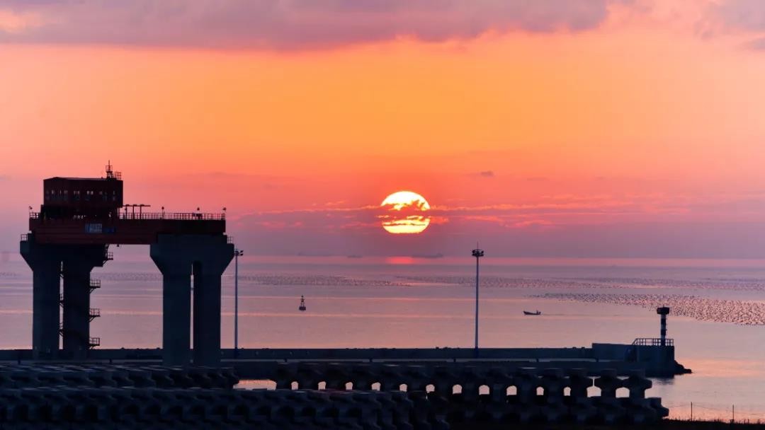 ▲2022年1月1日7时04分,“国和一号”示范工程大件码头迎来我国最早的海上日出