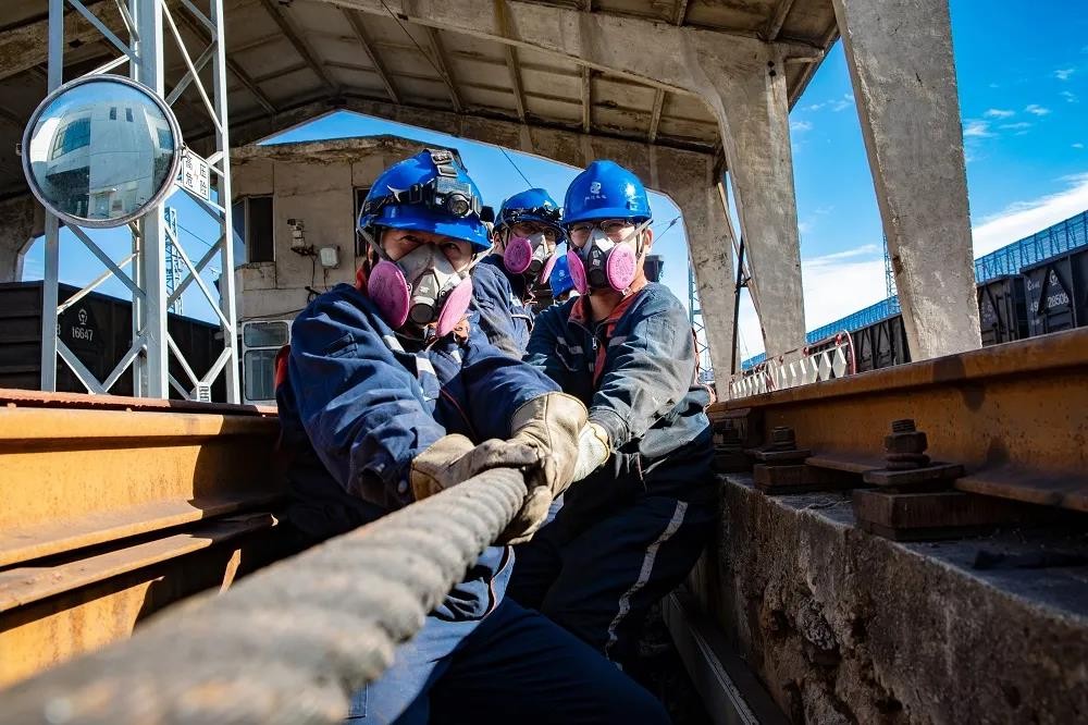 ▲内蒙古公司通辽发电总厂职工在狭窄的地沟里,正在对卸储煤系统翻车机重车铁牛钢丝绳进行检修