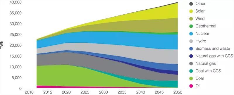 资料来源:1945-1979,IEA数据库和分析(1980-2012),能源信息管理局(2013-2050),IEA能源技术展望(2015)
