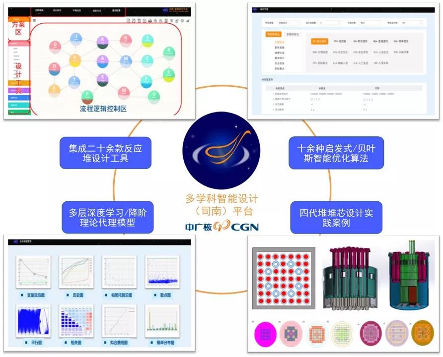 由中广核研究院自主研发的多学科智能设计(司南)平台,已集成二十余款核设计软件,开发十余种启发式/贝叶斯智能算法,研制多层深度学习/降阶理论代理模型,在先进堆型堆芯设计、屏蔽优化与安全分析等领域实践,实现跨专业定制化方案探索效率的大幅提升,创新性解决了有限资源约束下多目标智能设计的难题。