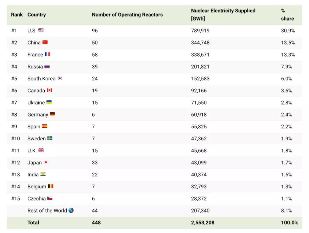 从核电占发电比例来看,各国排名如下: