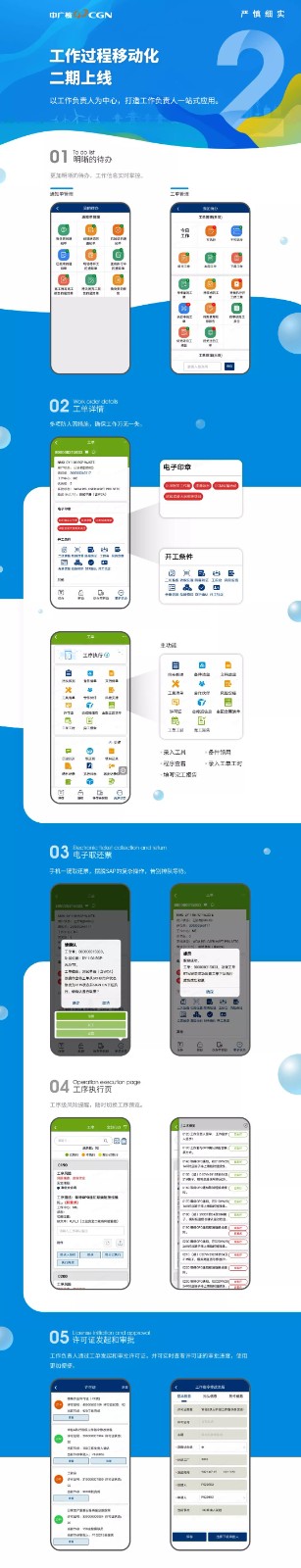 移动工单系统作为国内核电领域首个应用在核电大修业务领域的移动化应用,一方面坚持守正创新、攻坚克难,结合核电网络安全特点,实现了核电专网、办公网络、公共网络三网数据通信,集成了智能设备、AI实现OCR标牌识别、大数据等新技术应用;另一方面站在“开放、共享、协同”的角度,实现了项目的快速扩展和标准化推广。自2020年9月项目在大亚湾核电首次启用日常维修类工单以来,现场工作负责人共执行工单约2万张,节省现场作业时间近7000小时,且系统通过简单配置及权限开放即可投用。2021年12月该系统已完成在阳江核电、宁德核电、防城港核电的推广,2022年将完成红沿河核电、台山核电等在运核电站的推广应用。