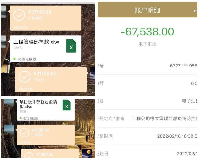 面对突如其来的疫情,徐大堡核电站所在地方社区、医护工作者、人民警察等工作人员扛起肩上的责任与担当,以高度的责任感冲锋在疫情防控最前线,我们在朋友圈看到了因工作时间长工作环境艰苦,晕倒在核酸检测现场的医务工作者,看到了在漫天飞雪中坚守的疫情防控志愿者的故事,这些工作人员深深地感动着我们。在项目党委倡议下,项目党员领导干部带头,全体职工积极响应,主动参与疫情防控爱心捐赠活动,共筹集到善款67538元,通过地方红十字会投入使用到疫情防控战役中,项目部干部职工以实际行动表达对战斗在抗疫一线的同志的敬意和支持,为一线抗疫人员献上中核力量。