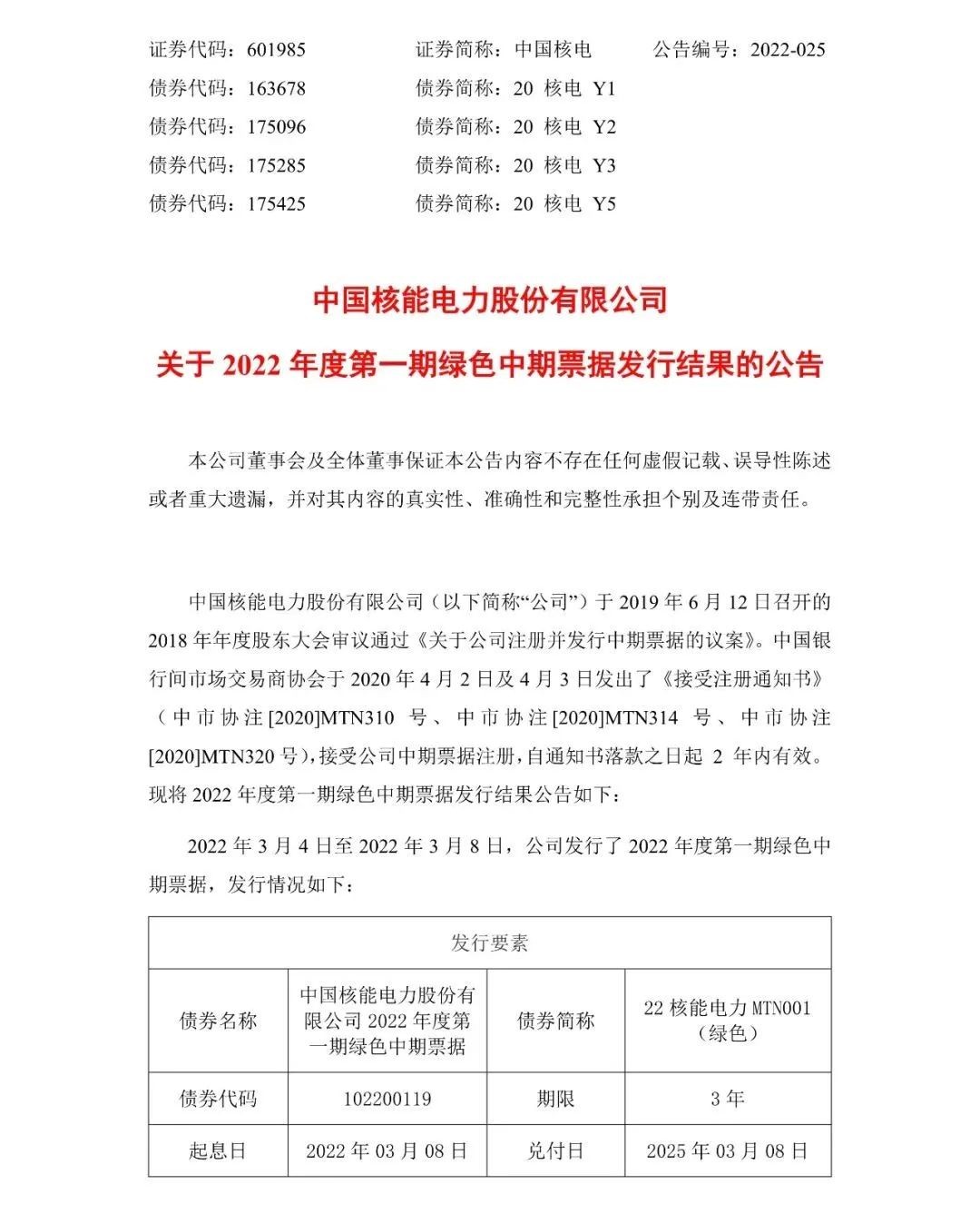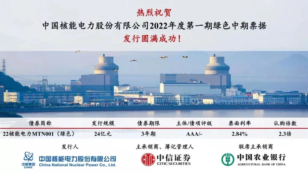中国核能电力股份有限公司2022年度第一期绿色中期票据发行圆满成功!