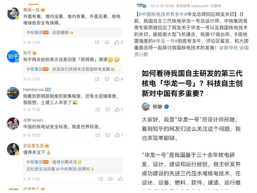 在今年全国两会期间,中核集团与知乎联合策划,邀请中核集团华龙一号总设计师、首席专家、中核工程总工程师邢继在新媒体平台开设账号,入驻知乎平台,在知乎上回答网友的提问。新华社微博、国资小新微博、科创中国微博等发布话题进行互动。
