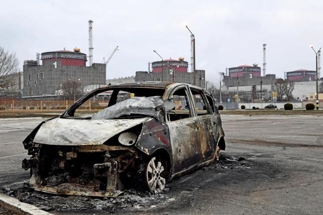 3月8日,乌克兰扎波罗热核电站周边,一辆被烧毁的汽车。图/人民视觉