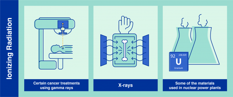 电离辐射的一些例子包括某些类型的癌症治疗,使用 X 射线和核电站中使用的放射性材料发出的辐射(信息图:Adriana Vargas/IAEA)