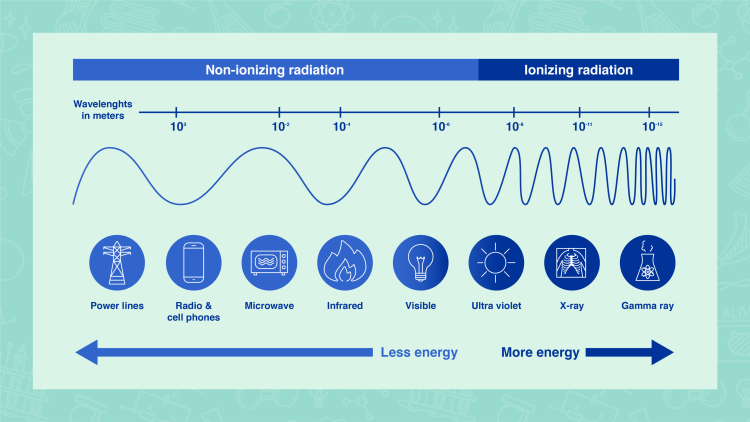 非电离辐射和电离辐射具有不同的波长,这与其能量直接相关。(信息图:Adriana Vargas/IAEA)。