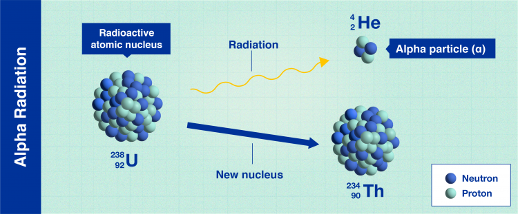 在 α 辐射中,衰变的原子核会释放出带正电的重粒子以变得更加稳定。这些颗粒不能穿透我们的皮肤造成伤害,并且通常可以通过使用一张纸来阻止。