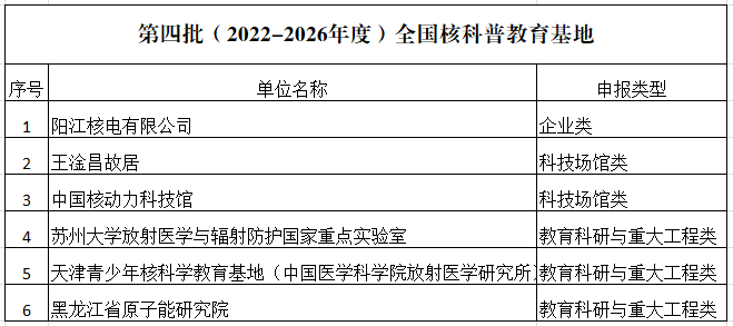 现将第四批(2022-2026年度)全国核科普教育基地评审结果公示如下,公示期5日(2022年3月22-28日)。