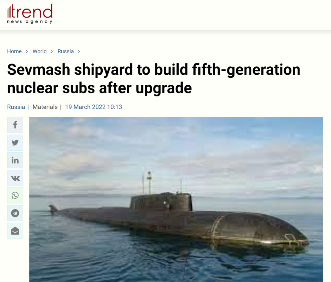 阿塞拜疆趋势通讯社网站报道俄罗斯要建造第5代核潜艇