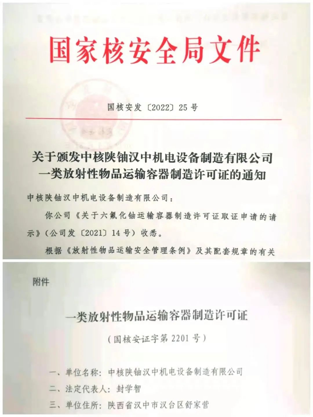 农历虎年开工之际,中核陕铀再传喜讯再获佳绩,汉中机电公司喜获由国家核安全局颁发的XN3000一类放射性物品运输容器制造许可证,陕铀机电正式成为国内少数几个掌握该容器制造关键核心技术的单位之一,该成果的取得将进一步有力助推中核陕铀开创更高质量发展新格局。