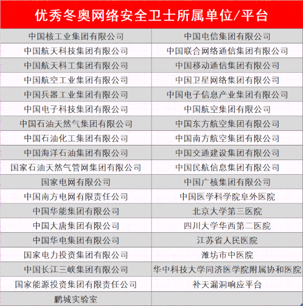 近日,冬奥网络安全卫士总结表彰大会召开。来自国资委、国家卫健委以及中核集团等29家央企及鹏城实验室等单位的“冬奥网络安全卫士”凭借在冬奥会及冬残奥会网络安保工作中的突出贡献获得表彰。