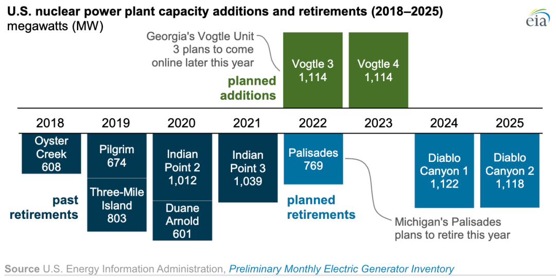 自2017年底以来,美国已经有6台总容量为4736兆瓦的核发电机组退役。另外3台总容量为3009兆瓦的机组计划在未来几年退役:密歇根州的Palisades核电站的一台机组计划在今年晚些时候退役,加利福尼亚州的Diablo Canyon核电站计划在2024年和2025年分别退役一台机组。