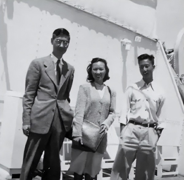 1956年郭永怀(左一)和夫人李佩(左二)在回国船上。