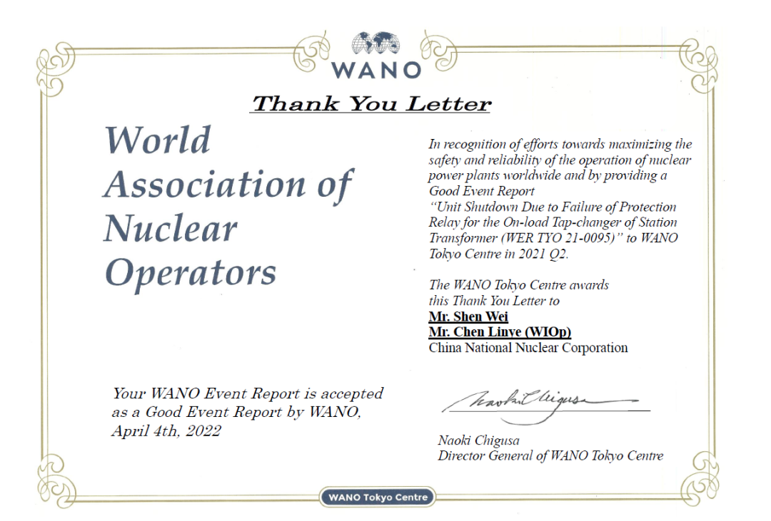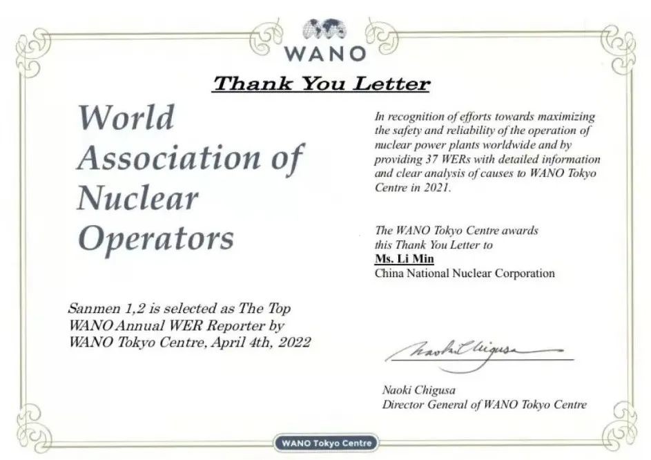2021年,中国核电6篇WER (秦山核电2篇、福清核电2篇、海南核电1篇、三门核电1篇)被评为WANO东京中心“年度优秀报告”,中核武汉 作为中国核电WER报送支持单位,获得WANO东京中心对于WER工作支持的感谢信。三门核电 获得WANO东京中心“2021年度最佳报告电厂”荣誉,自2020年以来,三门核电已连续两年获此荣誉。另外,WANO莫斯科中心对江苏核电 授予了“卓越管理奖”荣誉,对江苏核电2021年WANO支持工作给予充分肯定。