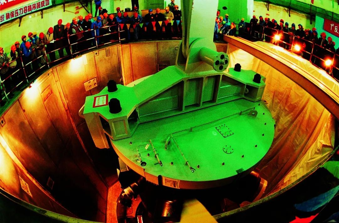 1999年3月31日,秦山二期核电工程1号机组反应堆压力容器吊装就位。