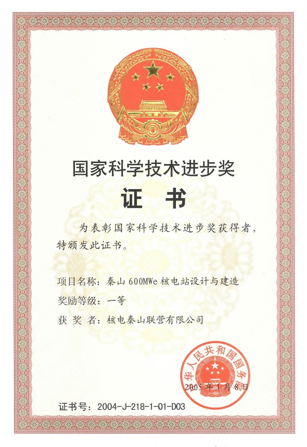 2005年1月8日,《秦山600MWe核电站设计和建造》项目荣获“国家科学技术进步奖一等奖”。