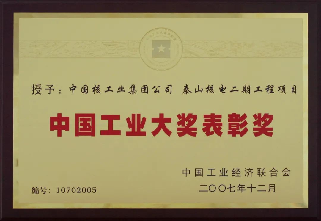 2007年12月26日,秦山核电二期工程项目荣膺中国工业大奖表彰奖。