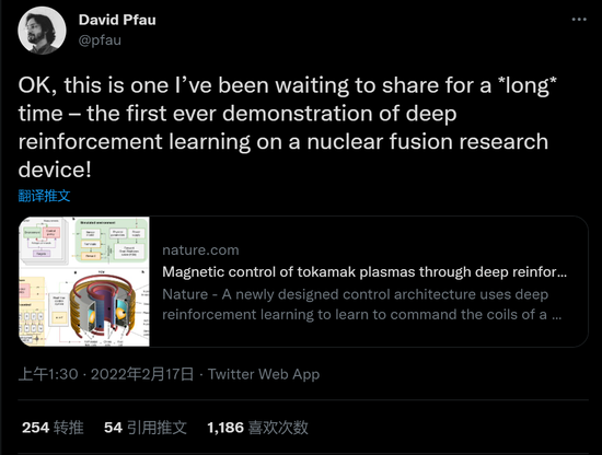 “这个时刻我等了好久啦——第一次在核聚变研究上演示深度强化学习!”DeepMind的科学家David Pfau激动的分享了自己的论文。(图片来源:机器之心)