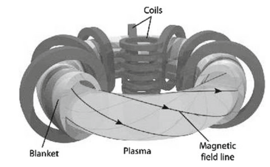 它的主体结构是一个内部抽真空的圆环。在圆环周围环绕着多个线圈,这样的线圈能提供沿圆环切线方向的磁场;圆环中心也有多个线圈,这些线圈提供垂直于圆环所在平面的磁场,以及沿圆环切线方向的感应电场。在这样的电磁场下,等离子体就可以被束缚在圆环中,并能为其进行欧姆加热(有电阻的物质在通过电流时会产生热量)。