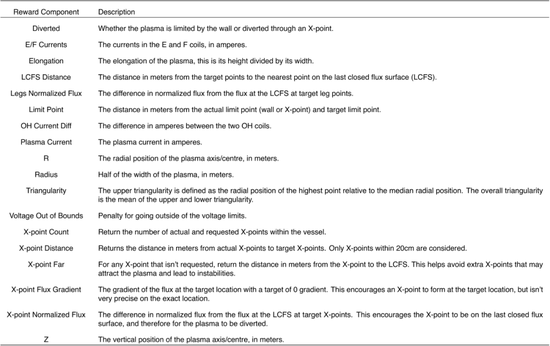 学习什么的,当然是目标最重要啦。目标可以包含各种各样期望的特征,包括但不限于等离子体位置、电流的基本稳定、具有指定延伸率和X点位置等的精确形状轮廓等等(如下表所示)。这些目标将组合成一个“奖励函数”(Reward Function),专门惩罚那些达不到目标的控制策略(就像学校的校规校纪)。尽管罗列了十多项特征,但奖励函数的设计确实已经是最小限度了,这样可以保证强化学习的算法具有最大的灵活性。(DeepMind:这都是为师的良苦用心啊!