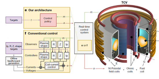 虽然说,聪明的人类已经掌握了其中的一些规律,可以根据想要的等离子体构型去反推电流电压等参数,就是……累了点。简单来说,可以根据这些掌握的规律,先粗略创建一个控制系统——比如要读取哪些传感器的输入数据啦,以及如何响应它们的变化啦;但是,在一个真实的核聚变过程中,等离子体的能量构型等总有一些奇奇怪怪的波动,所以还会有一个测量和建模相互迭代的过程,对原初系统进行实时调整,然后才产生了最终的控制系统。这样产生的控制器不仅来之不易,还只能用于同一种等离子体构型。但凡想在托卡马克中用一种截然不同的等离子体结构进行试验,就很可能要对系统进行大修特修。