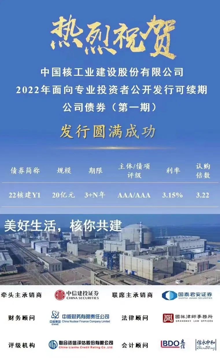 4月19日,中国核建成功发行2022年第一期可续期公司债券。本次发行募集资金20亿元,期限3+N年,发行利率为3.15%,资金用途主要用于置换高息贷款。