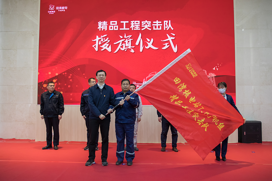 在授旗仪式上,当联委会副主任委员、中核工程总经理荆春宁把鲜红的“精品工程突击队”队旗郑重地交到突击队长马新朝手中时,使命必达的责任担当随之诞生。
