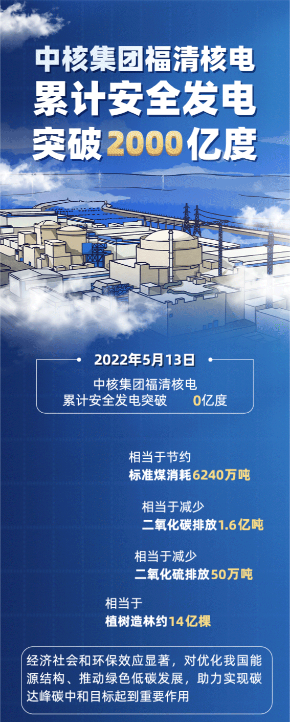 5月13日,中核集团中国核电旗下福清核电累计安全发电2000亿度,相当于累计节约标准煤消耗6240万吨,减少二氧化碳排放1.6亿吨,减少二氧化硫排放50万吨,植树造林约14亿棵,经济社会和环保效应显著,对优化我国能源结构、推动绿色低碳发展,助力实现碳达峰碳中和目标起到重要作用。