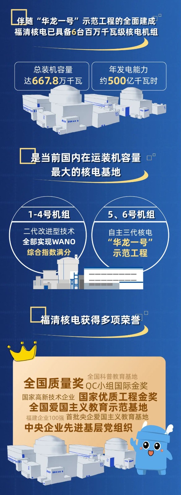 福清核电一次规划,分期建设6台百万千瓦级核电机组。1-4号机组分别于2014年至2017年相继投入商业运行,现全部实现WANO综合指数满分。5、6号机组是采用我国自主研发设计具有完全知识产权的三代压水堆核电技术的“华龙一号”示范工程。2021年1月30日,“华龙一号”全球首堆福清核电5号机组投入商运并保持安全运行;2022年3月25日,福清核电6号机组投入商运,“华龙一号”示范工程全面建成投产。福清核电6台机组总装机容量达667.8万千瓦,年发电能力超500亿千瓦时,成为目前国内在运装机容量最大的核电基地。